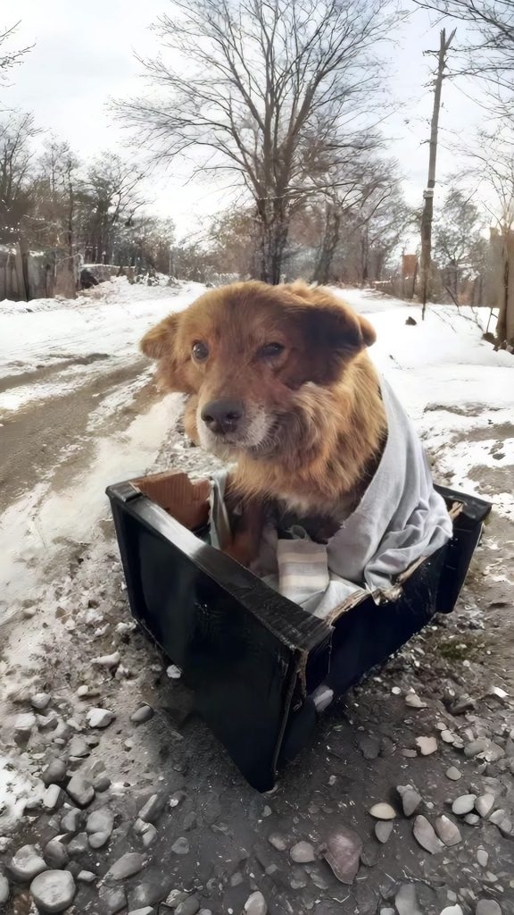 The dog was gently lifted and wrapped in warmth, her body light from exhaustion rather than size. She did not resist. She did not panic. Instead, she rested her head against the rescuer’s arm, as if she had been holding herself together long enough and could finally let go.