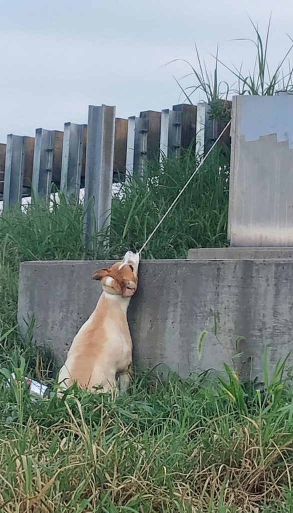 Suspended from a power box beneath the highway was an elderly dog struggling to stay conscious. An electrical cord was wrapped tightly around his neck. His body sagged under its own weight. His back legs trembled as they barely touched the ground.