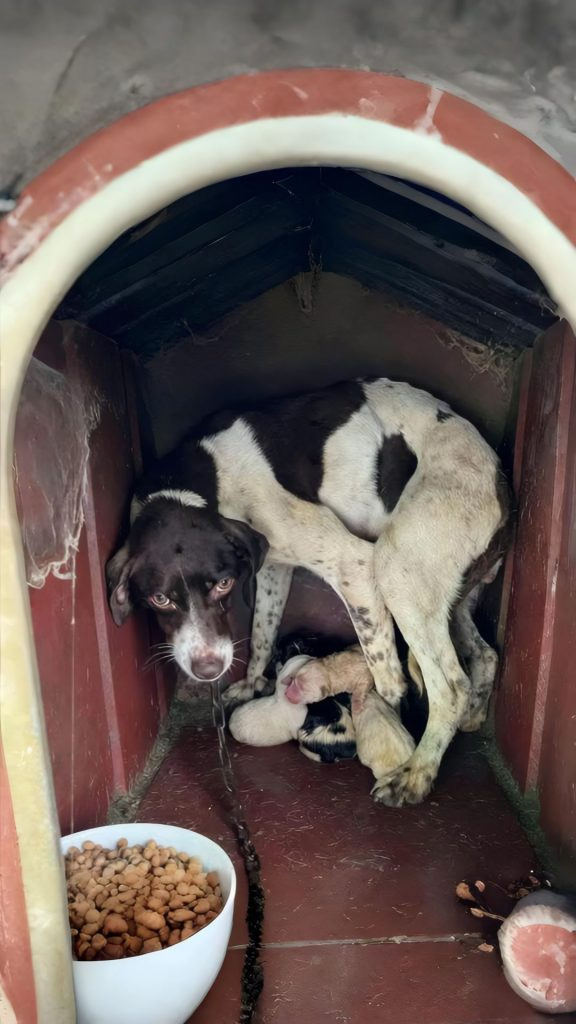 A short chain around her neck kept her tied close to the doghouse. Even if the river surged. Even if the storm worsened. Escape was not an option. So she stayed. Not because she wanted to, but because leaving was never a choice when her puppies needed her.