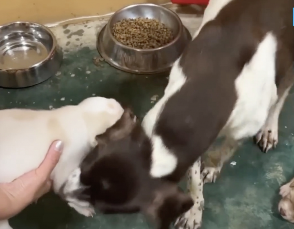 A rescuer gently placed a bowl of food near the entrance. Porter lifted her head slowly. Hunger was obvious in her thin frame, but she hesitated. Her eyes moved from the bowl to her puppies, then back again. Only after a long pause did she lean forward and take a small bite. Even then, she counted her puppies with her gaze, making sure every one of them was still there.