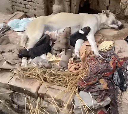 The mother stayed close, her movements tense, her attention fixed on her puppies.