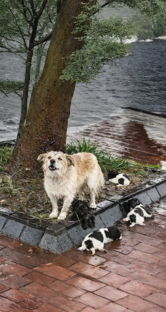 She pressed her puppies closer, shielding them from the wind and the steady fall of water. The puppies, too young to understand the world around them, relied entirely on her warmth.