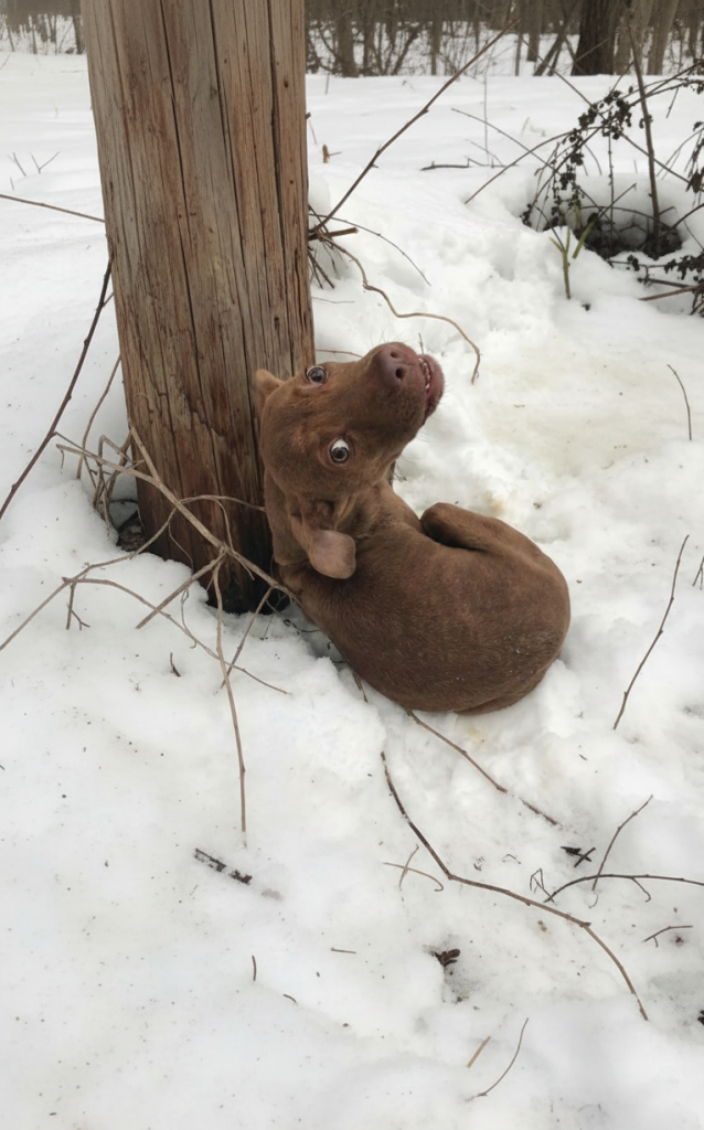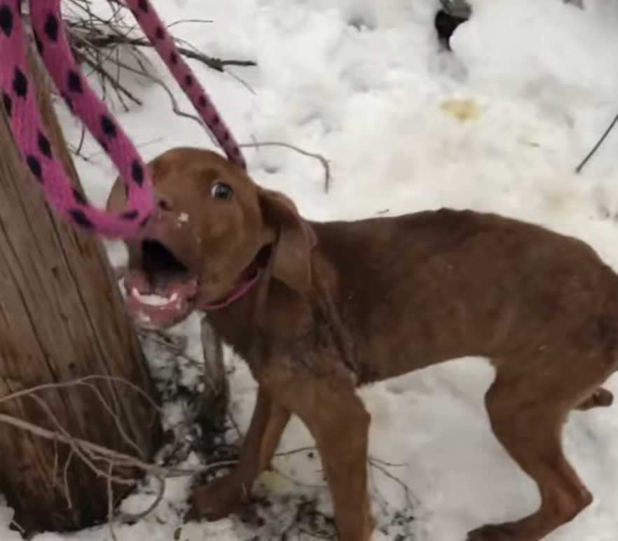 The alley was not a place meant to hold life. It was dark, damp, and rarely visited. Against a rusted post, a thin dog stood tied by a rope that had frozen stiff overnight. Ice coated the fibers, locking him in place and cutting into his neck with every small movement.