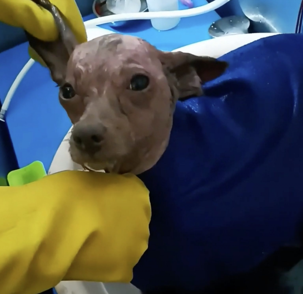 At the veterinary clinic, urgency filled the room. His condition was critical. There was no time to waste. The team began with a warm medicated bath, washing away layers of filth, infection, and pain that had clung to him for far too long.