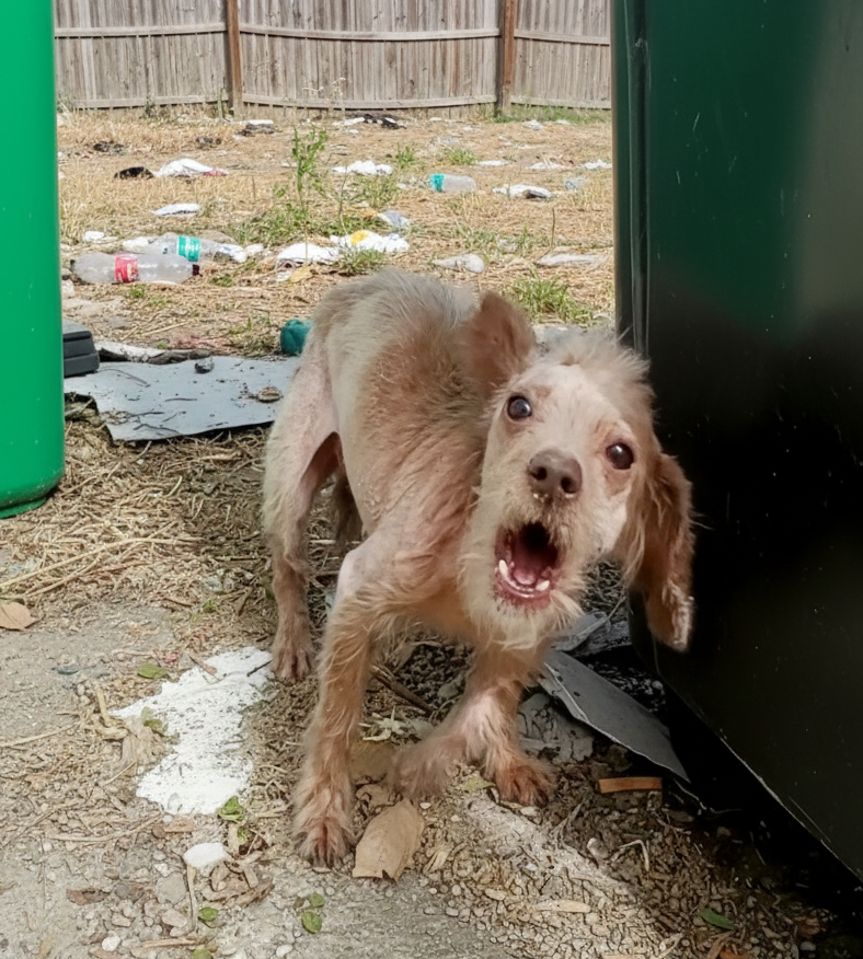 Near the trash cans, curled tightly against the ground, lay a dog so frail he almost blended into the mess around him. His body barely moved except for the painful rise and fall of his chest. It looked as if the world had already decided to forget him.