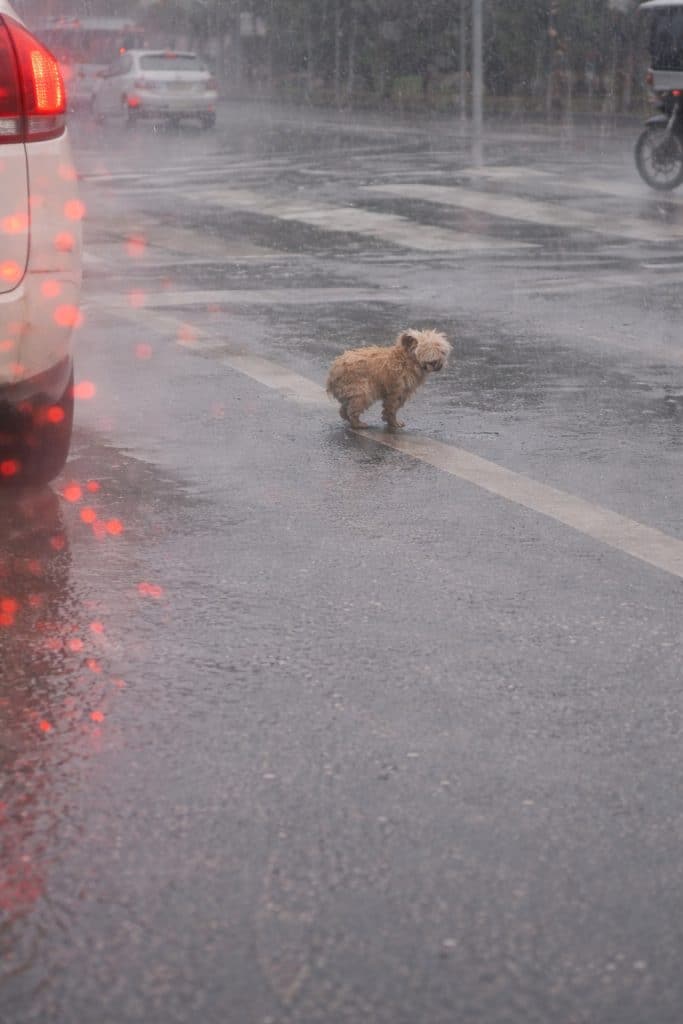 On a crowded highway during a heavy downpour, a tiny Poodle found himself alone in the middle of it all. The world didn’t stop. It rarely does. Tires cut through water, engines roared, and visibility blurred into gray streaks of movement.