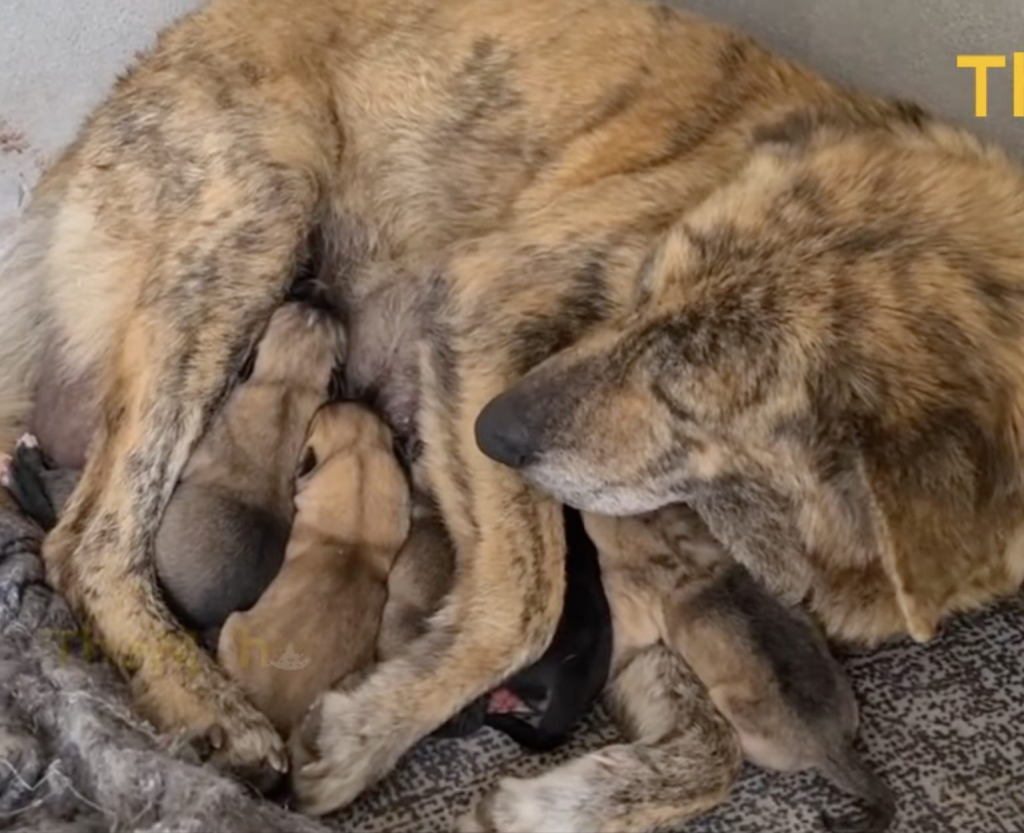 Hope lay resting with her babies tucked close, her body tired but her purpose clear. She cleaned them gently, nudged them toward warmth, and watched over them with steady devotion. The dog once abandoned at her most vulnerable moment had become exactly what she was meant to be. A mother surrounded by care.