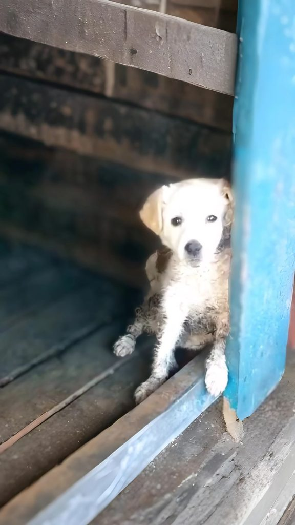 Her fur was dull and dusty, clinging tightly to a frame far too thin for such a young life. Each breath rose slowly, carefully, as though breathing itself required effort. Clean water and comfort had likely been absent longer than anyone could know. Yet what stood out most was not her condition. It was her quiet. She was no longer calling for help. She was waiting.