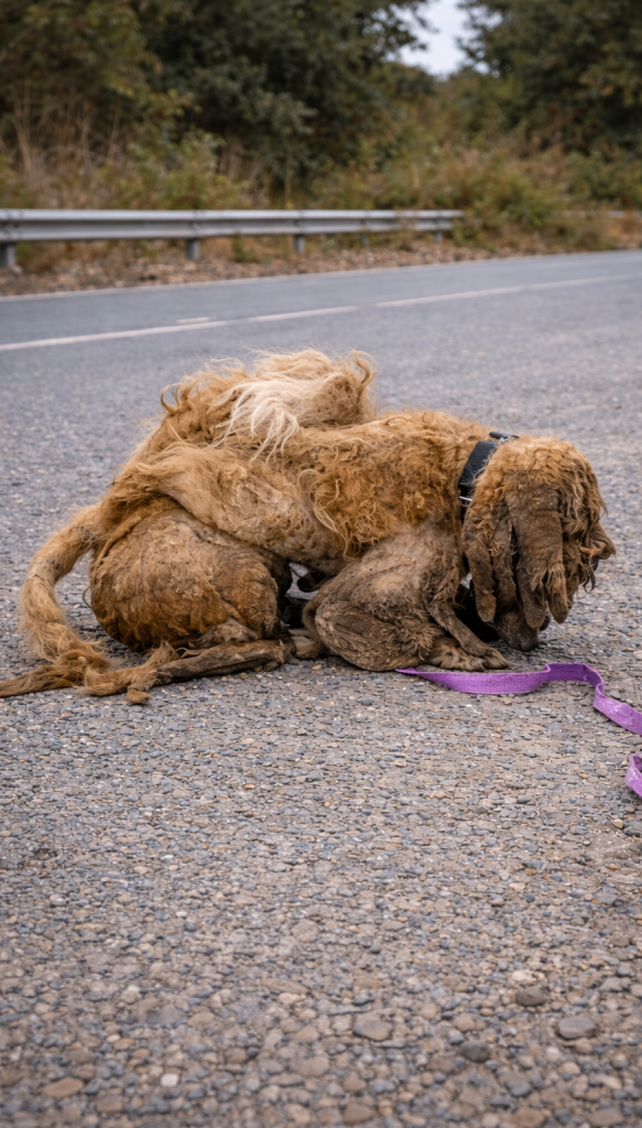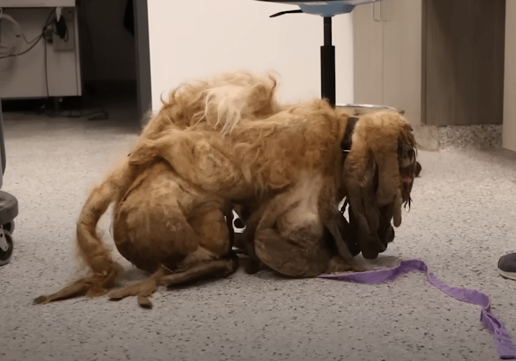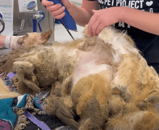 The dog’s fur had grown into thick, tangled mats that covered his entire body. These weren’t simple knots. They had formed into dense, heavy clumps that changed his shape completely. Some even stuck out so far that they gave the illusion of extra limbs.