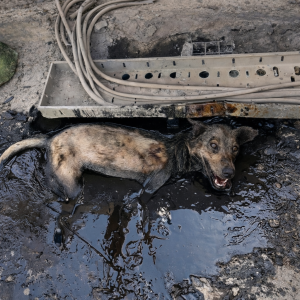 She searched for food for her hungry puppies near a factory, but something went wrong, and she needed help