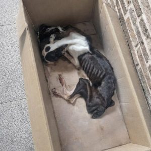 The dog lay quietly inside the box, her thin body barely moving. After losing the only person she trusted, she was left behind to fade away in silence.