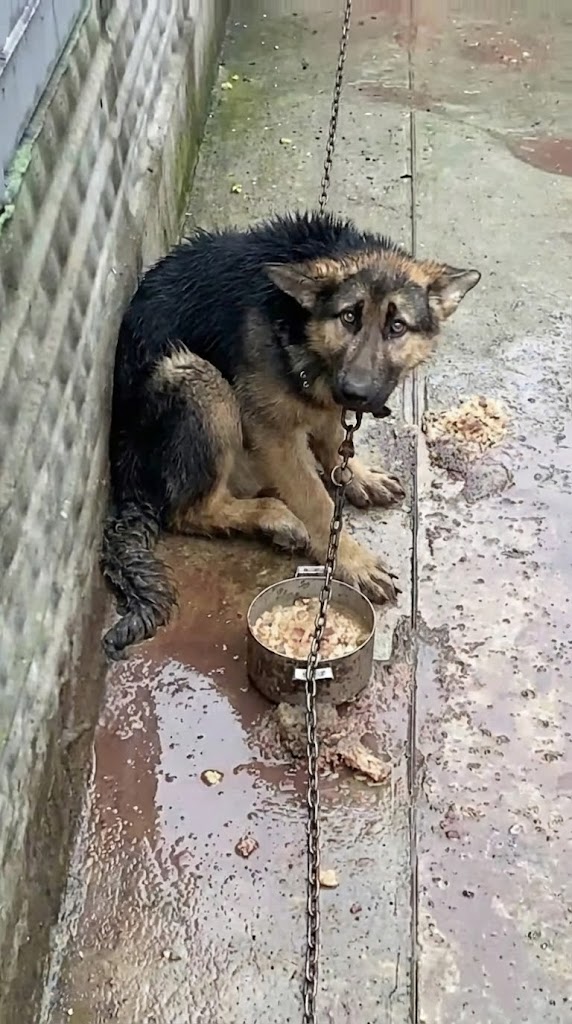 His entire life existed inside a narrow alley pressed between two aging buildings. Sunlight barely touched the ground. Rainwater pooled for days, leaving the concrete cold and slick beneath his paws. A thick metal chain kept him anchored to the wall, limiting his movement to just a few painful steps in any direction.