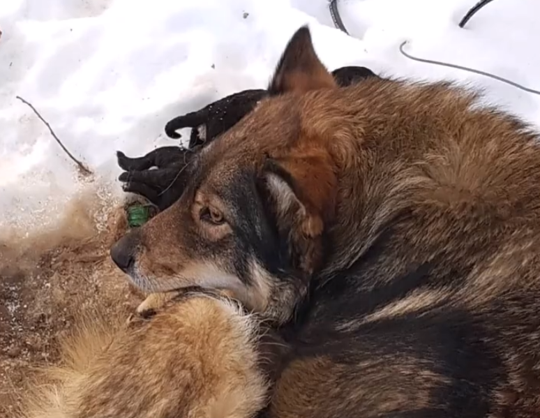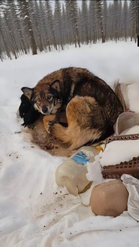 Curled into a shallow hollow beneath the trees lay a mother dog barely strong enough to lift her head. Ice clung to her fur. Her body shook uncontrollably, weakened by hunger, exhaustion, and the cold that pressed in from every side.