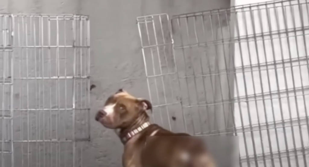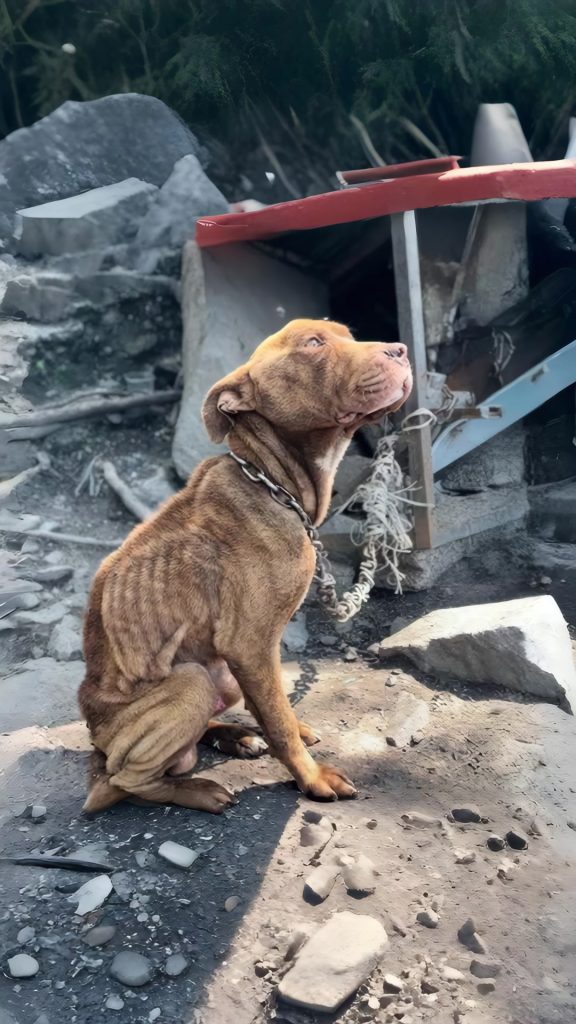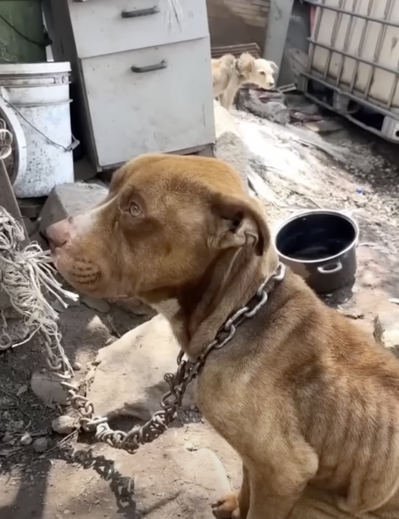 In the far corner stood a dog who barely moved. He did not bark. He did not flinch. He simply stood there as if movement had stopped meaning anything. A thick chain circled his neck, anchoring him to bare ground that offered no shade no warmth and no escape.