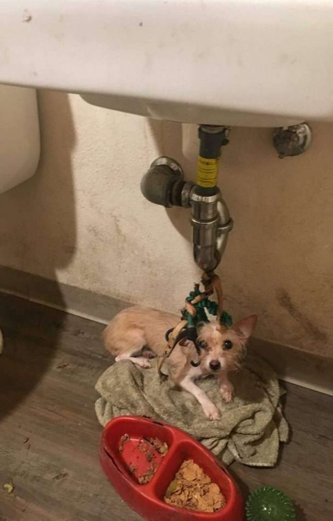 Following the noise, the manager opened the cabinet beneath the sink. What he found was heartbreaking. A tiny dog was tied up under the bathroom sink, injured, weak, and desperate. She had been left behind when the family moved out, abandoned as if she were disposable. There was no bed, no comfort, and no care. The only thing left for her was a bowl of Raisin Bran.