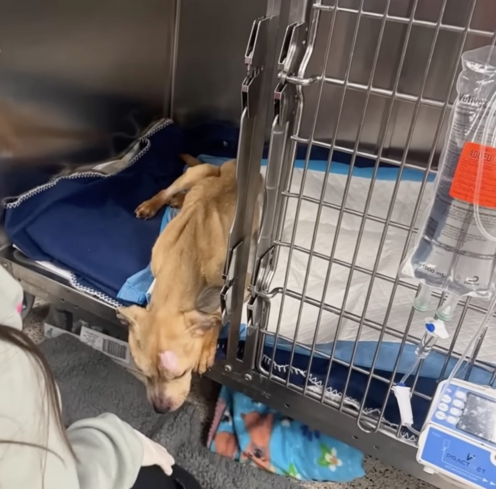 At the veterinary clinic, the room grew quiet as the medical team examined her. Severe dehydration had drained her strength. Malnutrition had weakened her muscles and organs. Her body struggled to perform even basic functions. Treatment began immediately. IV fluids were started. An albumin transfusion followed. Every step was slow and deliberate because even the smallest change could make a difference.