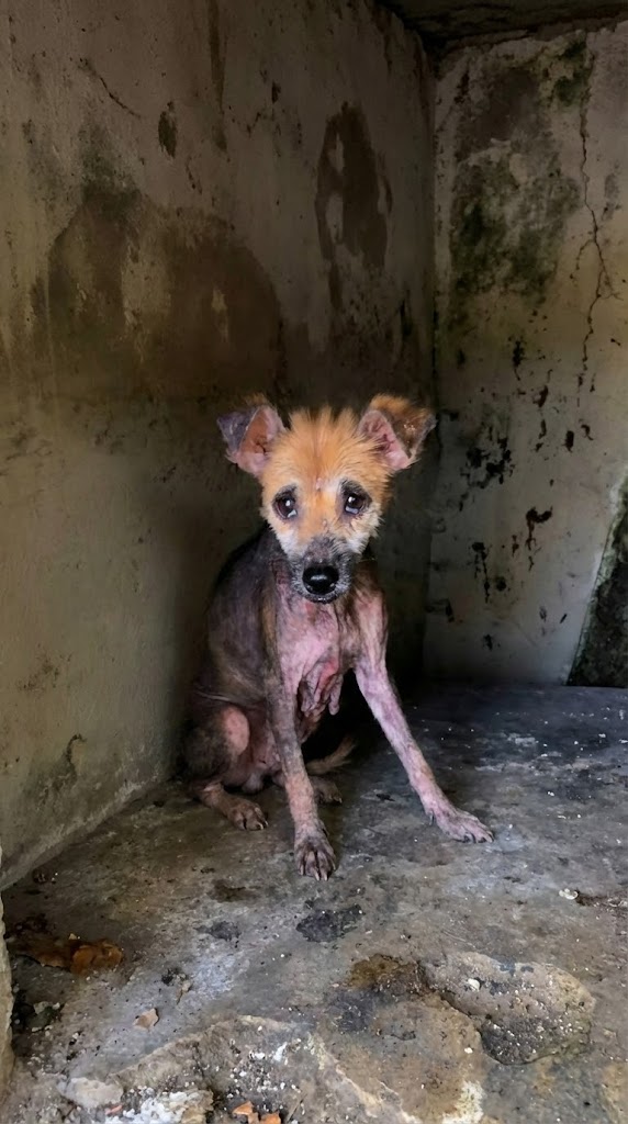 As rescuers stepped closer, the truth became impossible to ignore. Her skin was raw and inflamed. Severe mange had stolen most of her fur, leaving her exposed and vulnerable. Her eyes were swollen, cloudy, and infected. She did not bark or cry out. She simply waited.