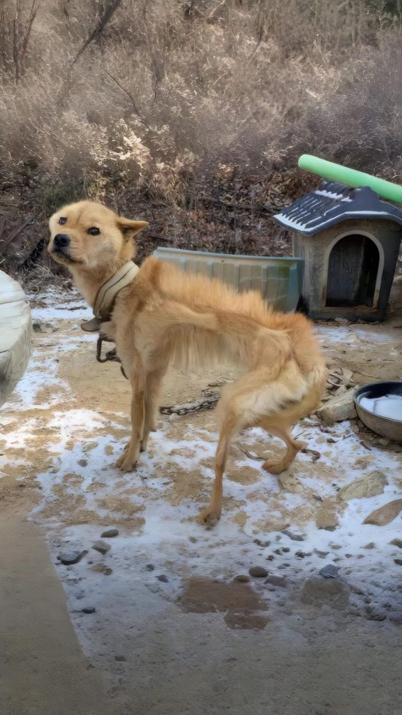 When rescuers first saw Donghee, she stood alone in a wide frozen field, tethered to a weathered wooden stake by a short rusted chain. Winter pressed hard against the land. The wind cut through open space with nothing to slow it. There were no houses nearby. No voices. No signs of life beyond the endless cold.