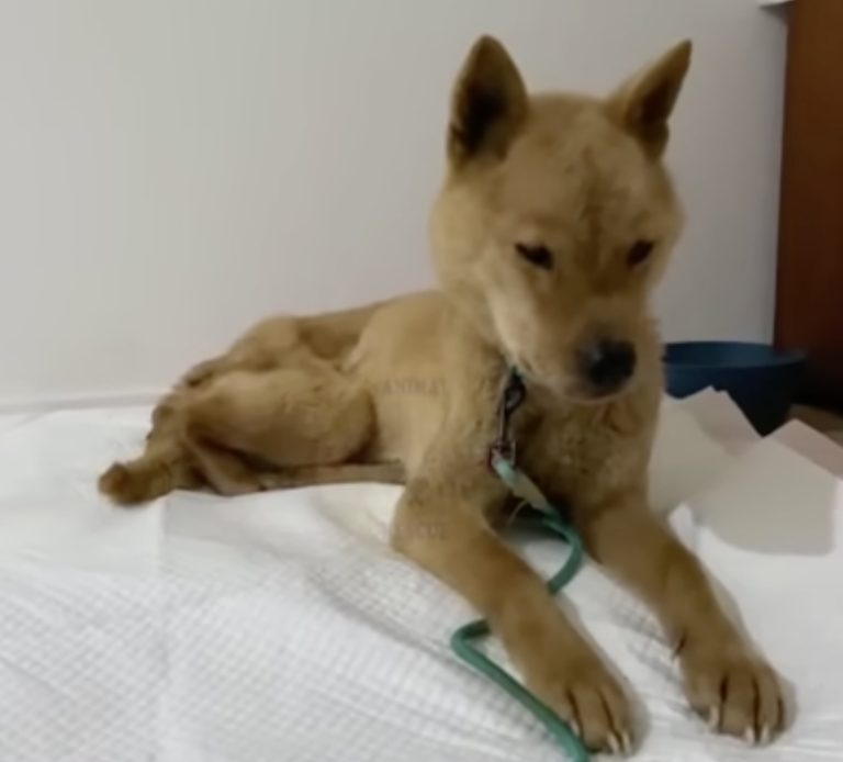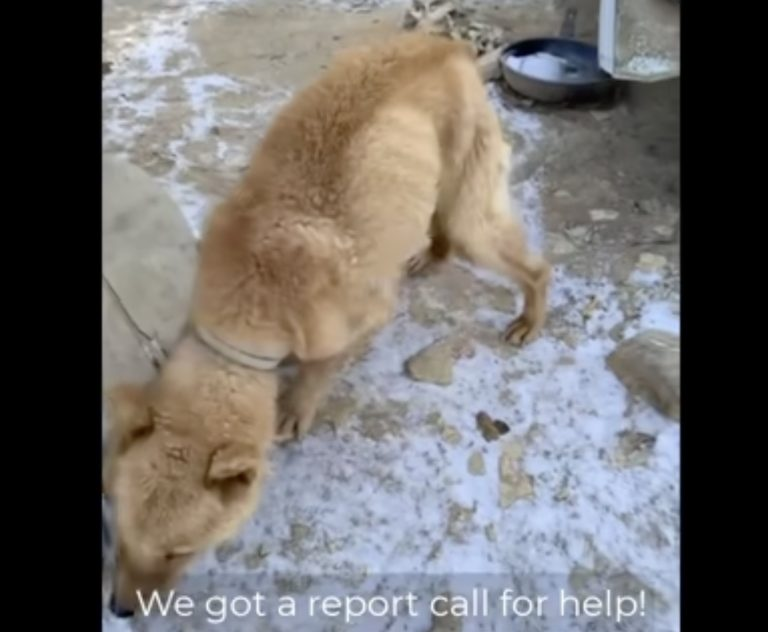 Her body told the story before anyone needed words. She was painfully thin, her frame trembling from hunger as much as from the cold. Her coat was rough and patchy, offering little protection against freezing air. Every bone pressed clearly beneath her skin. Yet what lingered most was her expression.