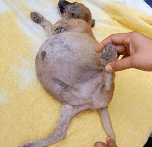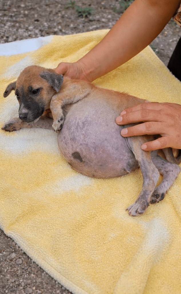 At first glance, the puppy’s condition raised immediate concern. His small body looked delicate, but his belly told a different story. It was swollen far beyond what seemed normal, tight and round in a way that didn’t match his size or age.