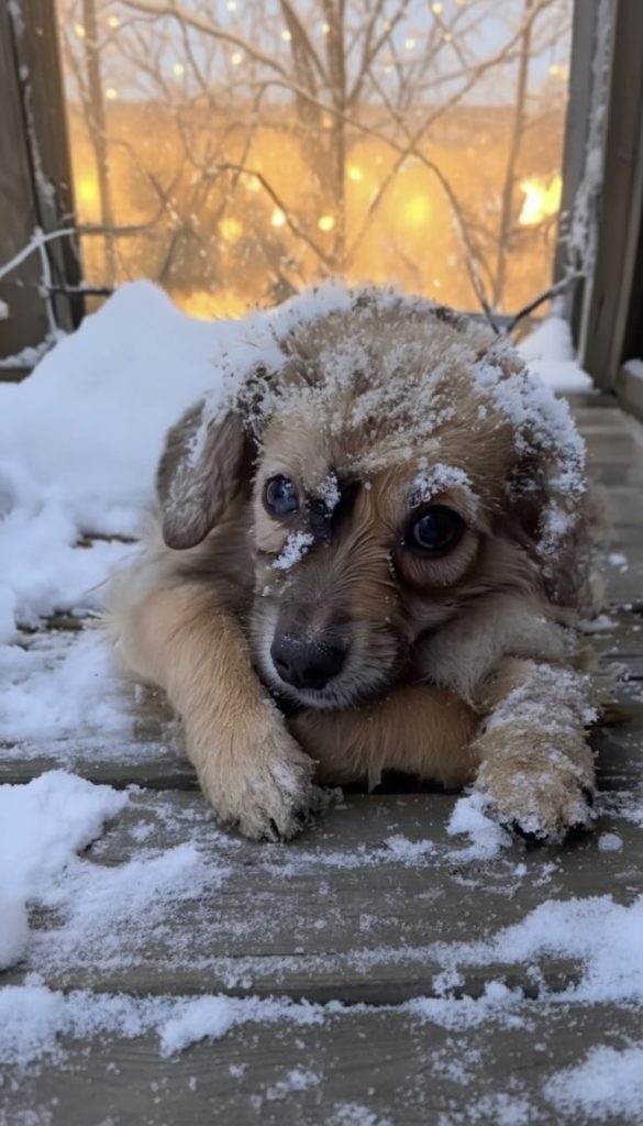 Tucked into the corner of a frozen porch, a small tan puppy curled into himself, shaking uncontrollably. His fur was thin and tangled, offering little protection from the biting air. He was not waiting for rescue or hoping for kindness. He was simply trying to stay alive. Every breath came shallow and fast, every movement drained what little strength he had left. Hunger and fear had already taught him not to expect much from the world.