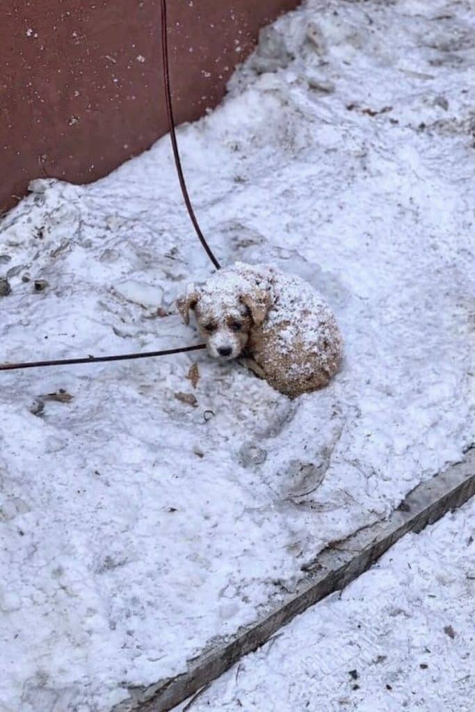 One bitter night, when temperatures dropped to nearly minus ten degrees, a tiny puppy lay alone in the snow. His small body blended into the white ground, almost invisible beneath the falling frost.