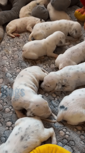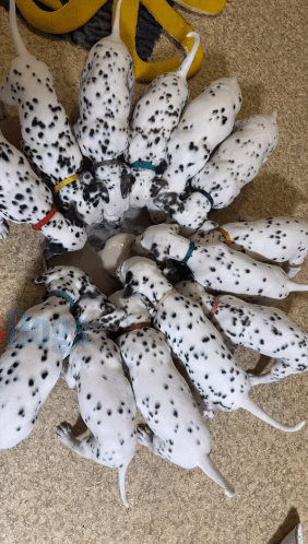 Thirteen healthy Dalmatian puppies were growing stronger each week. Their playful energy filled the house with life and laughter.