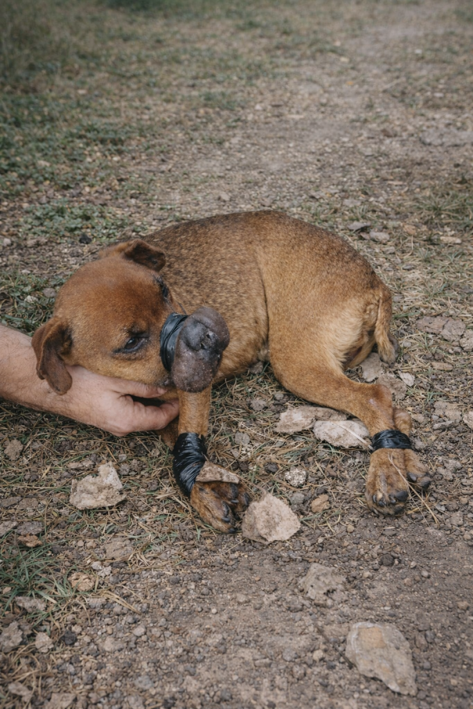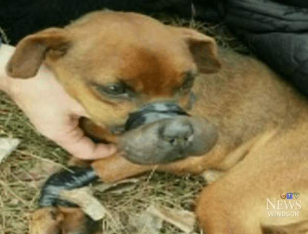 One year ago, in a quiet area near a tire store in Ontario, Canada, a seven-year-old dog lay alone in a vacant lot. She could barely move. Her breathing was shallow and strained. Electrical tape had been tightly wrapped around her muzzle and paws, leaving her immobilized and in visible distress.