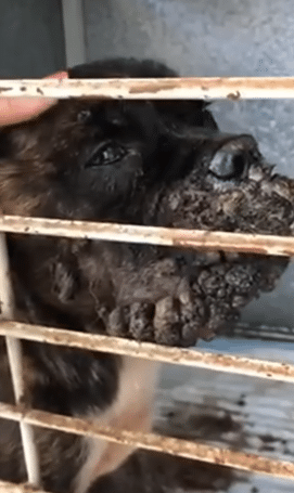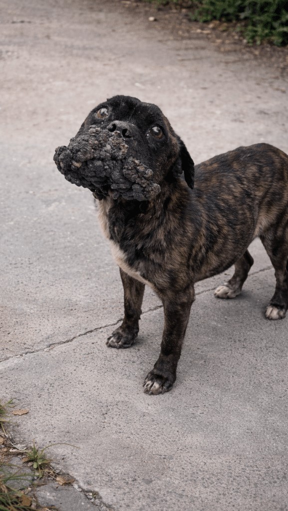 When Ares was first discovered, people didn’t immediately recognize the dog he would become. They saw a fragile body, a quiet presence, and a face that told a story far deeper than words ever could. Something around his muzzle had grown into a heavy, uncomfortable condition that made everyday life difficult. Eating took effort. Drinking wasn’t simple. Even resting seemed like a challenge.
