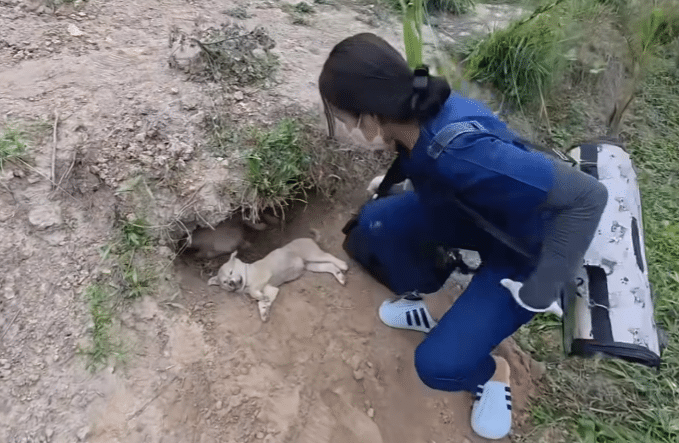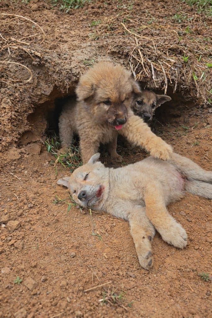 The standing puppy trembled slightly, his body thin and unsteady. His ribs showed beneath his fur, a quiet sign of how long he had gone without proper nourishment. Yet he wasn’t focused on himself.