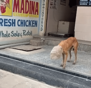 A thin brown stray dog wandered through busy streets with his entire head stuck inside a large, cloudy plastic jar.