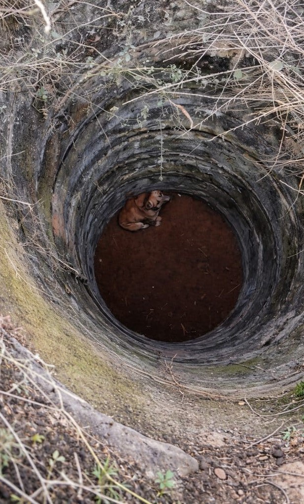 A dog had fallen into a deep well in the middle of an open field.
