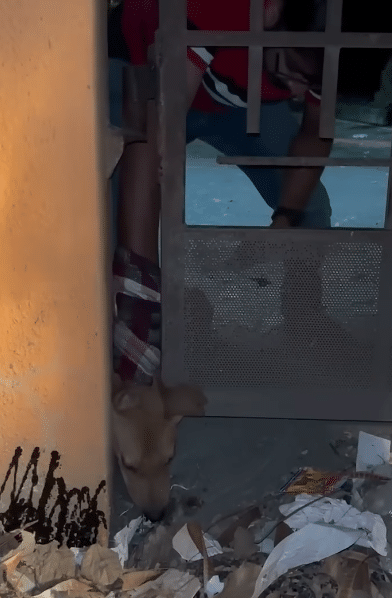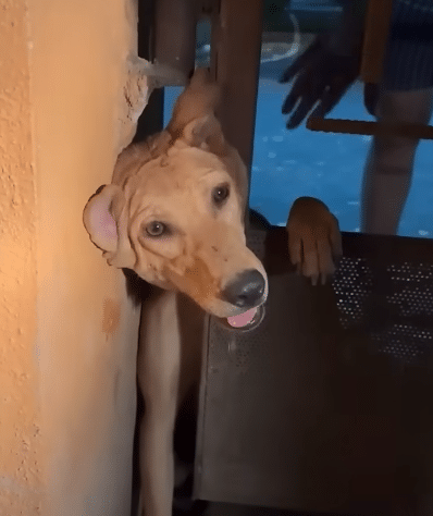 Once her head and shoulders pushed through the tight opening, her body followed—until it couldn’t. The space narrowed abruptly. Her shoulders wedged. Her front legs twisted awkwardly beneath her. When she tried to back out, the rough concrete scraped against her sides, and the metal bars blocked her from turning.