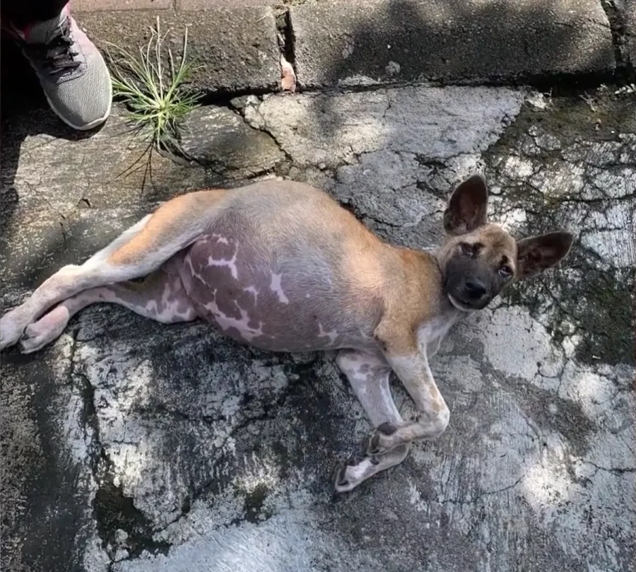 He was found lying near the edge of a noisy street, where engines roared past and footsteps never slowed. Most people saw nothing more than another stray blending into the chaos. But when you looked closer, the truth was impossible to ignore.