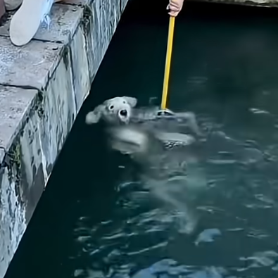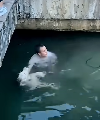 A large white dog fell into a deep canal with smooth concrete walls and no escape route. As he struggled to stay afloat, one man attempted to rescue him using a hooked pole. Realizing the urgency, another man jumped into the canal to support the dog from below. Soon, nearby bystanders formed a human chain to help pull the dog safely onto solid ground. Their coordinated effort saved the exhausted animal and demonstrated how courage, teamwork, and quick thinking can turn a crisis into a powerful moment of unity.