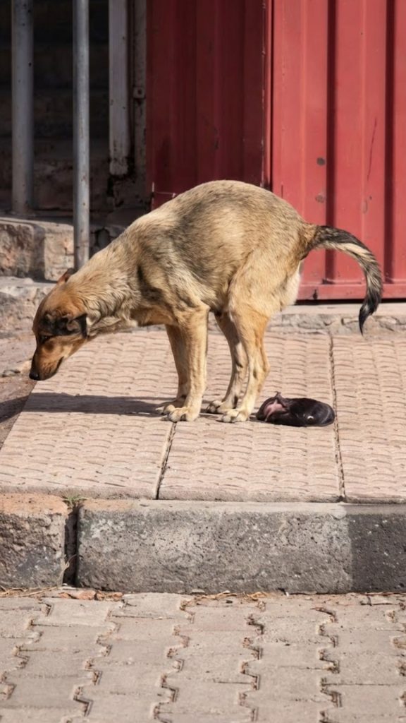 On a crowded roadside filled with noise, movement, and indifference, a quiet scene unfolded—one that could have easily been missed. A stray mother dog, frail and exhausted, struggled through the final moments of giving birth.