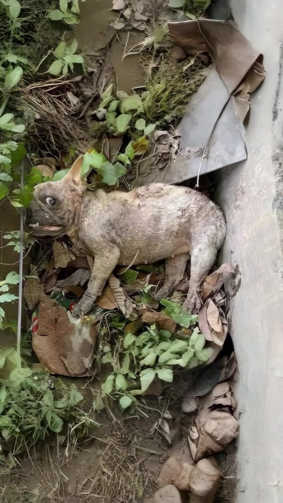 She was found on an ordinary afternoon in a place most people avoid looking at for too long. Near a dumping area scattered with broken furniture, rusted metal, and forgotten waste, she lay beside a crumbling structure as if she had become part of the debris herself. At first glance, she was easy to miss. Her coat blended into the dusty ground. Her body remained still. She did not call out. She did not move to draw attention. She simply existed, quiet and worn down, waiting.