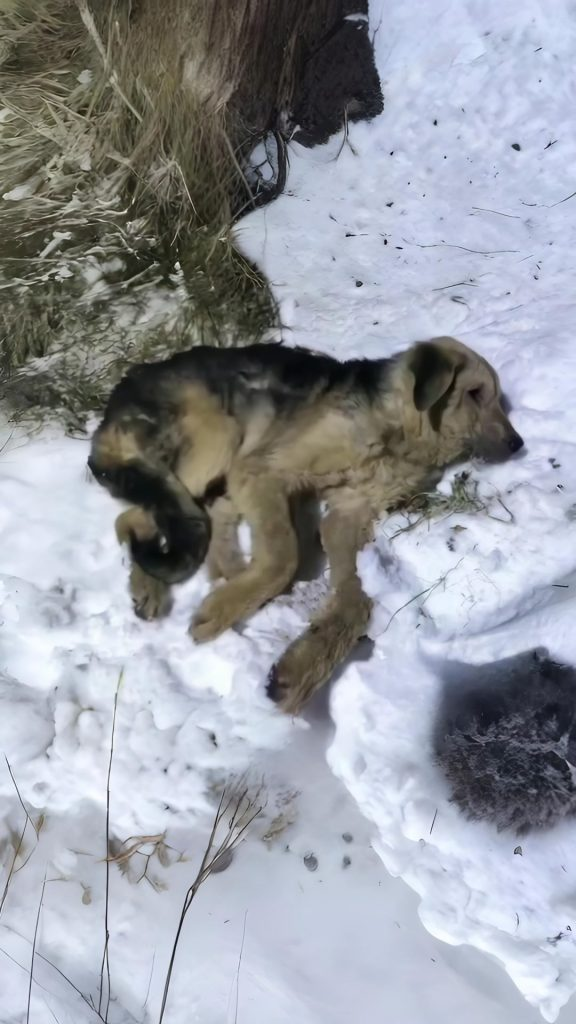 The world that day was wrapped in white. Snow covered streets rooftops and sidewalks, softening sound and slowing time. Near the edge of a road where cars passed without stopping, the dog curled himself into a shallow hollow in the snow. His body shook with each breath. Not from fear alone, but from exhaustion that had settled deep into his bones. He did not bark. He did not cry. He did not have the strength. All he could do was breathe and wait.