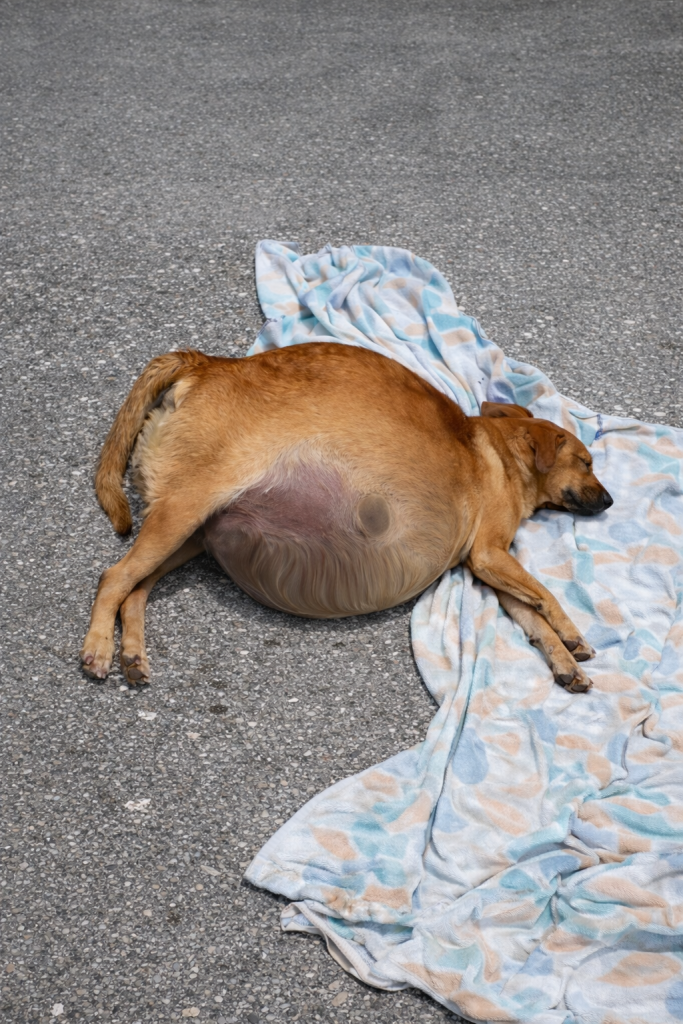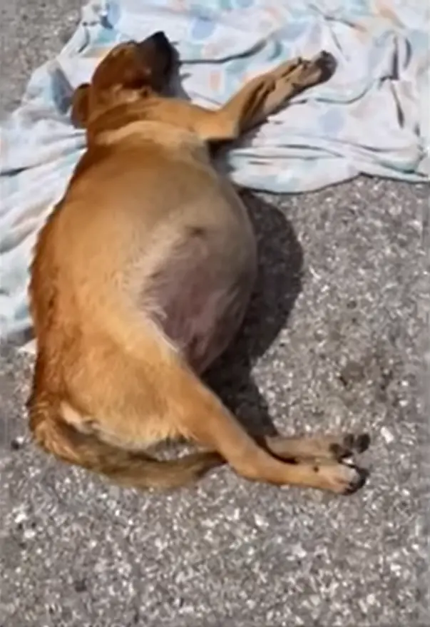 At first glance, she looked like a dog simply resting. But something felt wrong. Her breathing was shallow. Her body was weak. And her abdomen was severely swollen — stretched far beyond what looked normal or healthy. It wasn’t the fullness of a well-fed animal. It was the tight, heavy swelling of a body under extreme internal pressure.