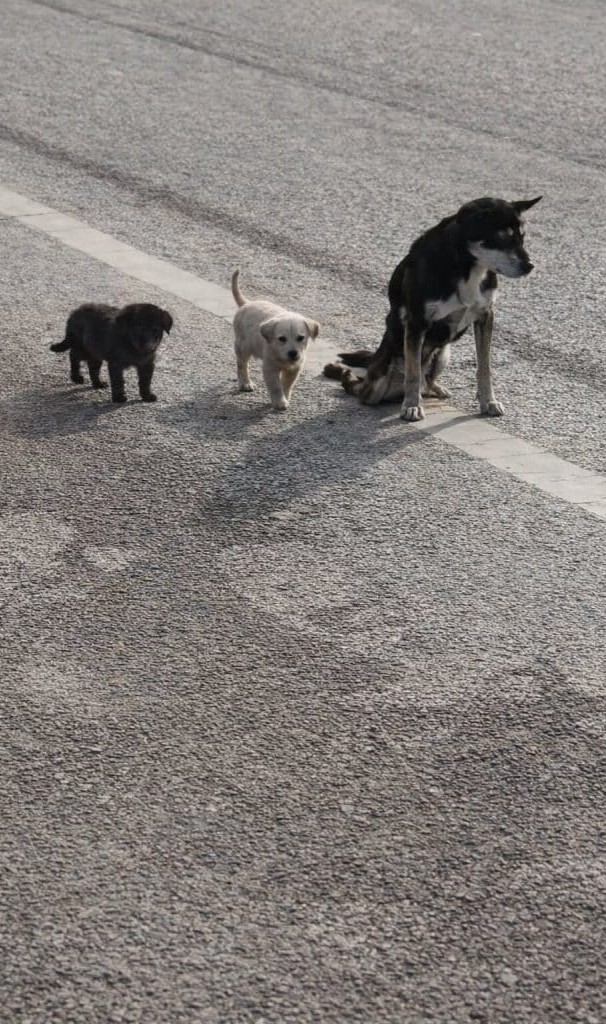 Right beside her were two tiny puppies—fragile, uncertain, but determined to stay close. They leaned into her warmth, following her slow movements, trusting her completely.