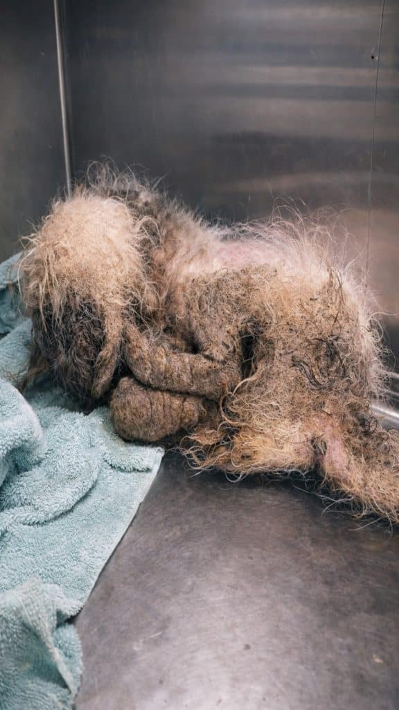 Her fur had grown severely matted over time, forming thick knots that restricted her movement and hid the true condition of her skin. Matted fur can become painful, pulling tightly on the body and trapping moisture against the skin.