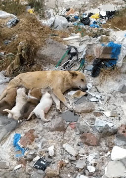 In the Mustafa Kamel district of Egypt, an injured stray dog with broken hind legs was discovered caring for her puppies among debris in a garbage dump. Despite severe injuries and exhaustion, she continued nursing and protecting her young after losing six of her ten newborn puppies. A compassionate man named Ahmed Abdel Hamid noticed the struggling family and began visiting daily, bringing food and water to support them. Over time, the remaining four puppies grew stronger and more active thanks to consistent care. However, the mother’s injuries still require medical attention and safer living conditions for the family’s long-term well-being. This story highlights the resilience of maternal instinct and the powerful impact of compassion when someone chooses to help rather than look away.