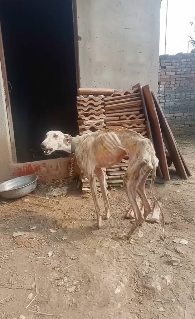She stood alone in an empty forgotten yard, barely moving, barely breathing. A rusted chain circled her neck, pinning her to the same small patch of dirt that had been her entire world for nearly ten years. The ground around her looked untouched, as if life had stopped trying to grow there long ago.