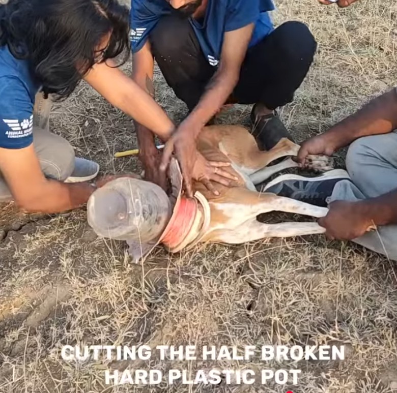 A stray dog in a rural village near Hyderabad survived ten days trapped inside plastic containers that prevented her from eating or drinking. The accident began when she got her head stuck in a plastic pot while scavenging for food. Although villagers initially removed the pot, a leftover plastic rim remained around her neck, causing a second container to become tightly lodged around her head. Unable to rescue her alone, villagers contacted the Animal Warriors Conservation Society, which traveled 160 kilometers overnight to help. After an early morning search, rescuers captured the weakened dog using a net and carefully cut away both plastic traps. Once freed, she regained her ability to breathe, eat, and move normally. The rescue not only saved her life but also highlighted the dangers of plastic waste and the importance of compassion, community effort, and dedicated animal rescue work.