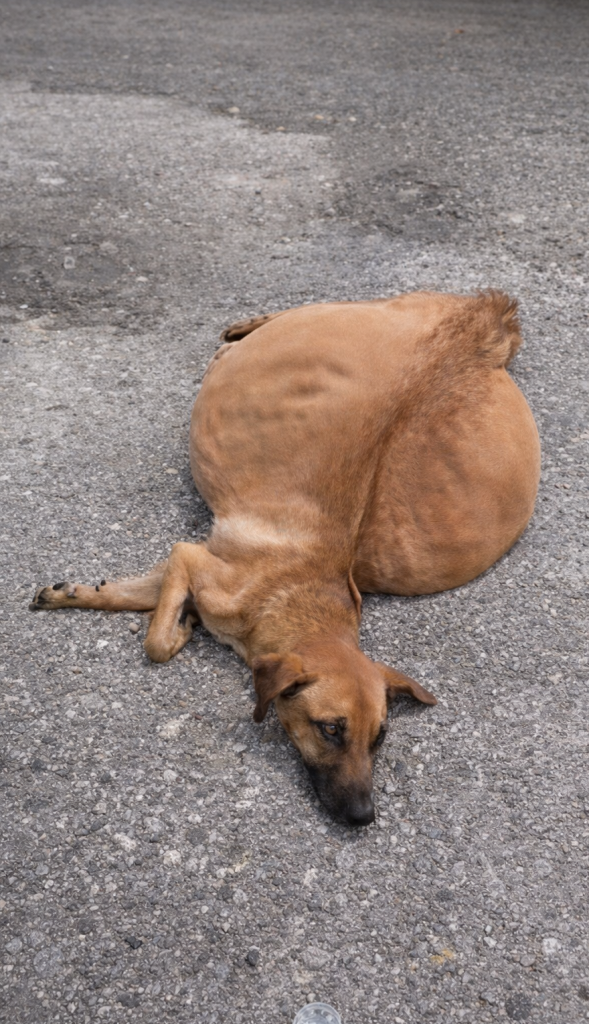 When rescuers arrived, Azalea had somehow dragged herself out of the trash and onto the road. She could barely move. Her body looked unnaturally large, her abdomen stretched tight and swollen to the point it seemed ready to burst. She had stopped fighting. Her eyes told the story of a dog who had reached the edge of exhaustion.