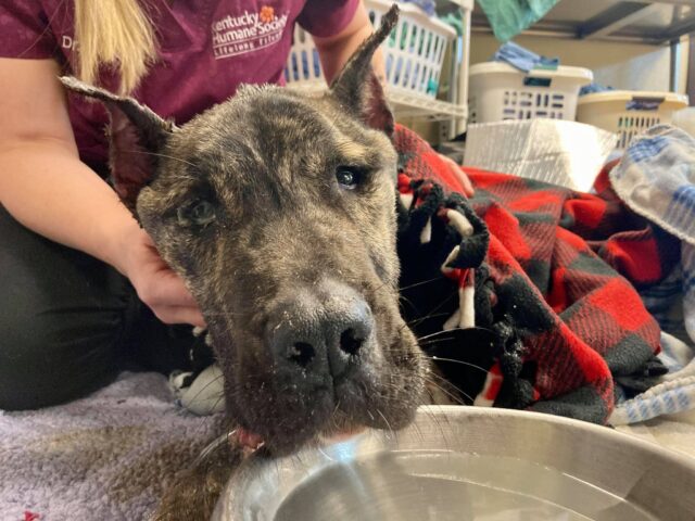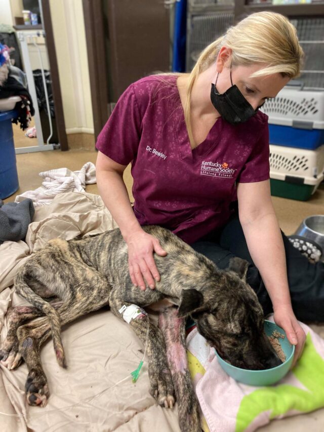 Just before noon on a quiet Friday in Louisville Kentucky, someone noticed a dog lying still in a parking lot. At first glance, he looked like a shadow. Something forgotten. Something already finished. When staff from the Kentucky Humane Society arrived, their hearts sank.