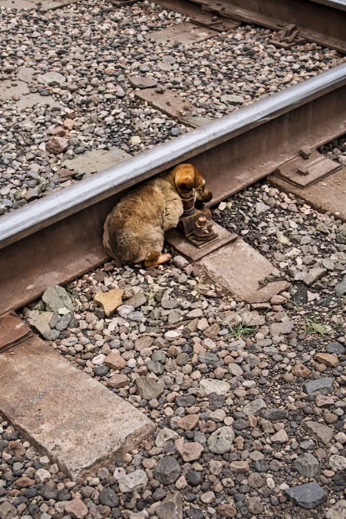 He barked sharply. He clawed at the metal door. He twisted his body toward the tracks as if trying to escape back to the place he had just been pulled from.