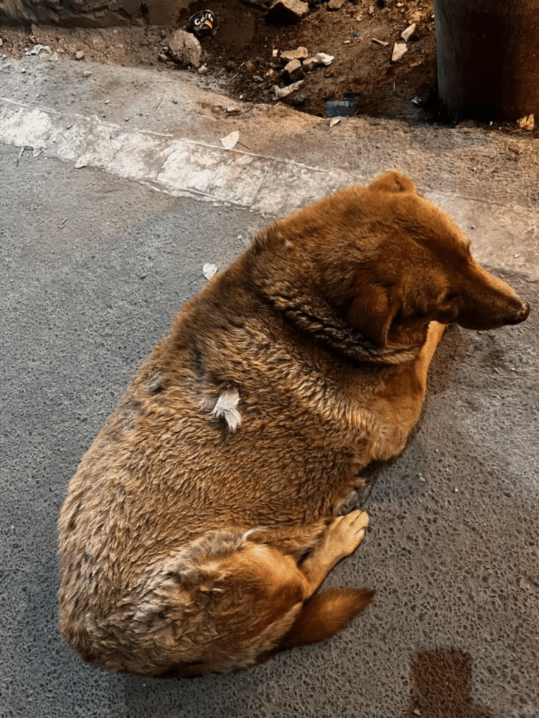 He was small enough to be overlooked at first. His fur was dirty and tangled. His ribs showed through his thin frame. His tail wagged softly, almost politely, as if greeting the chaos around him.