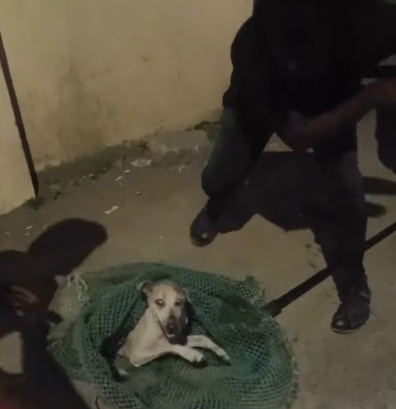Using a specialized net, they gently secured the dog’s body to prevent further injury. No shouting. No grabbing. Just steady, controlled motions designed to minimize stress.