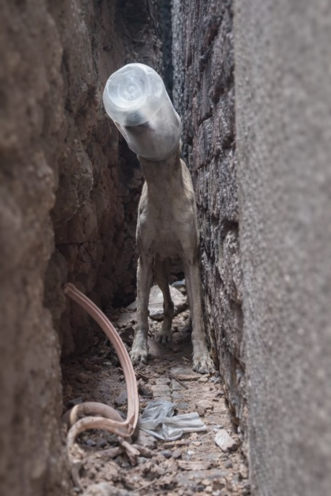 A call reached the Animal Warriors Conservation Society. The description was urgent: a dog stuck between walls, head trapped in plastic, moving erratically.